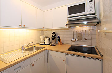 Komplett ausgestattete, offene Küche mit Kühlschrank, Gefrierfach, Herd mit Cerankochfeld und Kombiheißluftbackofen mit Mikrowelle, Geschirrspülmaschine, Senseo-Kaffeepadautomat, Kaffeemaschine, Toaster, Wasserkocher sowie ausreichend Koch- & Essgeschirr |