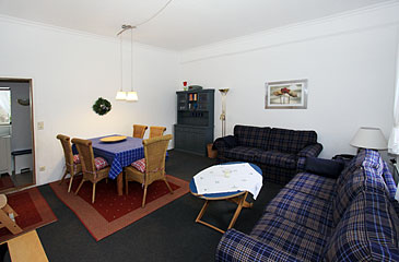 Gemütliches Wohn- / Esszimmer mit Sofaecke und Esstisch sowie Sat / LCD Flachbild-TV, Blue-ray-Player, Stereoanlage und Telefon. |