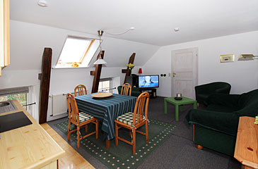 Gemütliches Wohn- / Esszimmer mit Sofaecke und Esstisch sowie Sat / LCD Flachbild-TV, Blue-ray-Player, Stereoanlage und Telefon. |