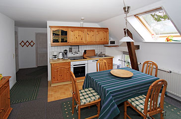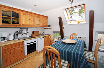 Komplett ausgestattete, offene Küche mit Kühlschrank, Gefrierfach, Herd mit Cerankochfeld und Backofen, Geschirrspülmaschine, Mikrowelle, Senseo-Kaffeepadautomat, Kaffeemaschine, Toaster, Wasserkocher sowie ausreichend Koch- & Essgeschirr |