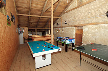 Es gibt eine Tischtennisplatte, Kindertraktoren, Bobbycars und Tischfußball in der Spielscheune. Eine Sandkiste, eine Babyschaukel, Wippe und Rutsche für die Kleinen.