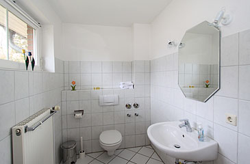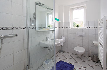 Geräumiges Duschbad mit Fön und Handtuchheizkörper sowie ein extra Gäste-WC |