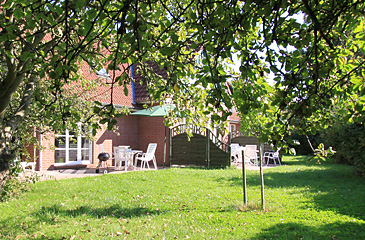 Sonnenterrasse mit Gartenmöbeln und angrenzendem Garten mit viel Platz zum spielen