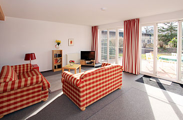 Geräumiges Wohn- / Esszimmer mit großer Sofaecke und Esstisch sowie Sat / LCD Flachbild-TV, Blue-ray-Player, Stereoanlage, Telefon und Ausgang zur Sonnenterrasse und dem Garten. |