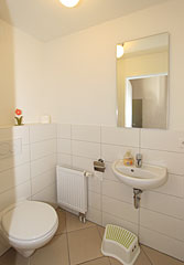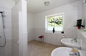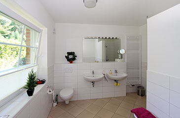 Geräumiges Duschbad mit 2 Waschbecken, Fön und Handtuchheizkörper sowie ein extra Gäste-WC |