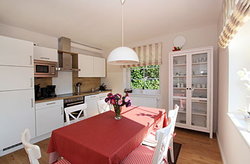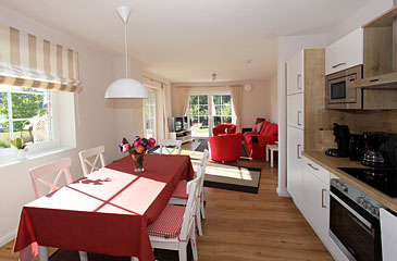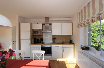 Komplett ausgestattete, offene Küche mit Kühlschrank, Gefrierfach, Herd mit Cerankochfeld und Backofen, Mikrowelle, Dunstabzugshaube, Geschirrspülmaschine, Senseo-Kaffeepadautomat, Kaffeemaschine, Toaster, Wasserkocher sowie ausreichend Koch- & Essgeschirr |