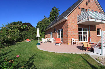 Große Terrasse mit Gartenmöbeln und angrenzendem Garten mit viel Platz zum spielen und relaxen |