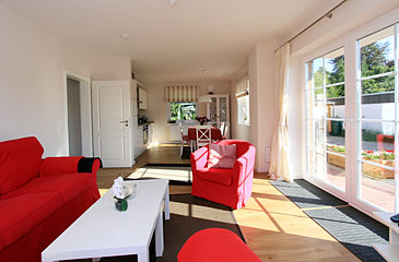 Geräumiges Wohn- / Esszimmer mit großer Sofaecke und Esstisch sowie Sat / LCD Flachbild-TV, Blue-ray-Player, Stereoanlage, Telefon und Ausgang zur großen Sonnenterrasse und dem Garten. |