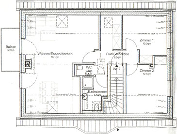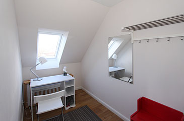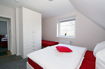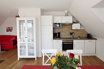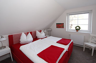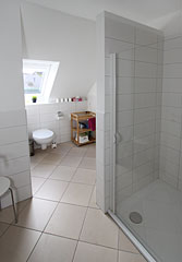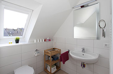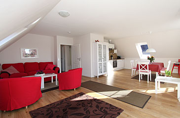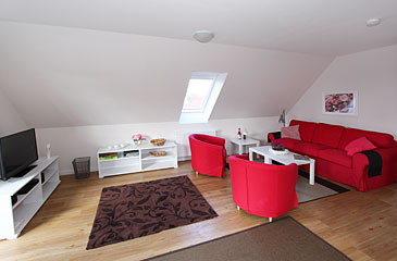 Die obere Ferienwohnung ist 85 m² groß, für 2 bis 4 Personen optimal geeignet und erstreckt sich über das komplette Dachgeschoss. Die Wohnung ist modern eingerichtet und mit allem Komfort ausgestattet.