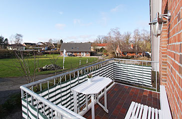 Sonniger Balkon mit Sitzgelegenheiten und Ausblick auf den Ferienhof |