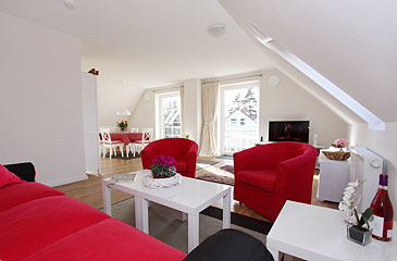 Geräumiges Wohn- / Esszimmer mit gemütlicher Sofaecke und Esstisch, Sat / LCD Flachbild-TV, Blue-ray-Player, Stereoanlage, Telefon und Ausgang zum sonnigen Balkon mit Sitzgelegenheiten. |